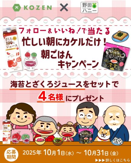 小善本店様の海苔フレークと、野田ハニー食品工業様のざくろジュースを掛け合わせ、商品単体ではなく、朝の食卓をイメージできるプレゼントキャンペーンを行いました。