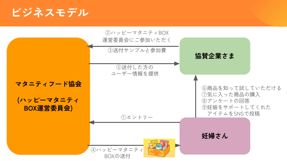 マタニティフード協会が運営する「ハッピーマタニティBOX運営委員会」にて、商品を集めて、発送いたします。メーカー様は、お試しできる商品の提供と、参加費の用意のみでご参加いただけます。