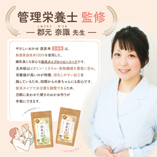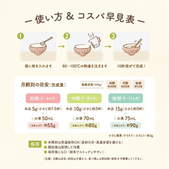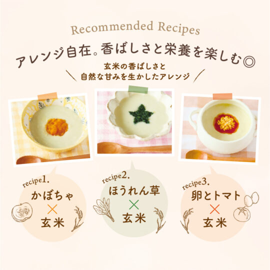 管理栄養士監修の簡単レシピ付きで、月齢に応じてお湯で手軽に調理できる、やさしい主食です。