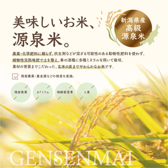 玄米由来の食物繊維・ミネラルを含むのが特長です。香料・着色料・保存料は使用していません。残留農薬・無機ヒ素・カドミウム・放射性物質・硝酸態窒素について各種検査を実施。