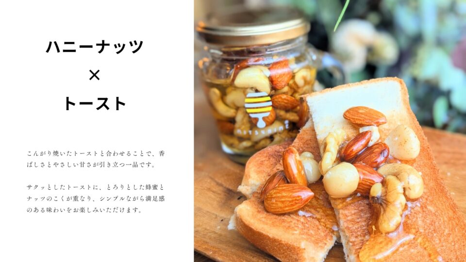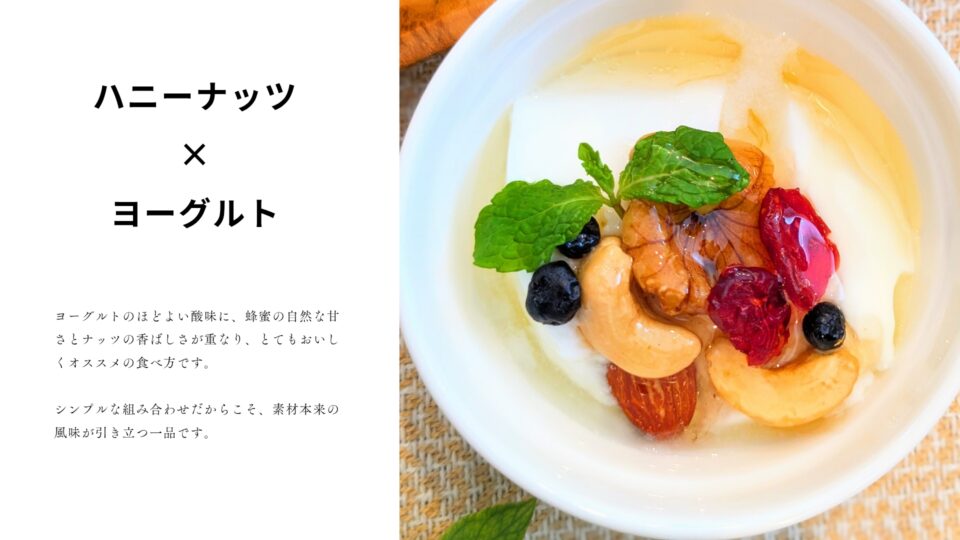 ナッツにはビタミンEや食物繊維、ミネラルなどが含まれており、ナッツの香ばしさと蜂蜜のまろやかな甘みが調和し、そのままはもちろん、ヨーグルトやトーストにもよく合います。