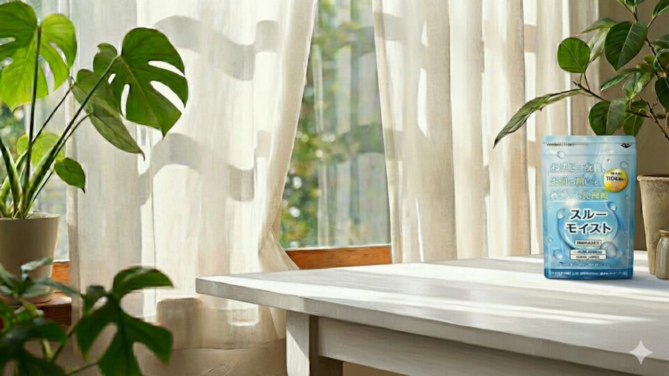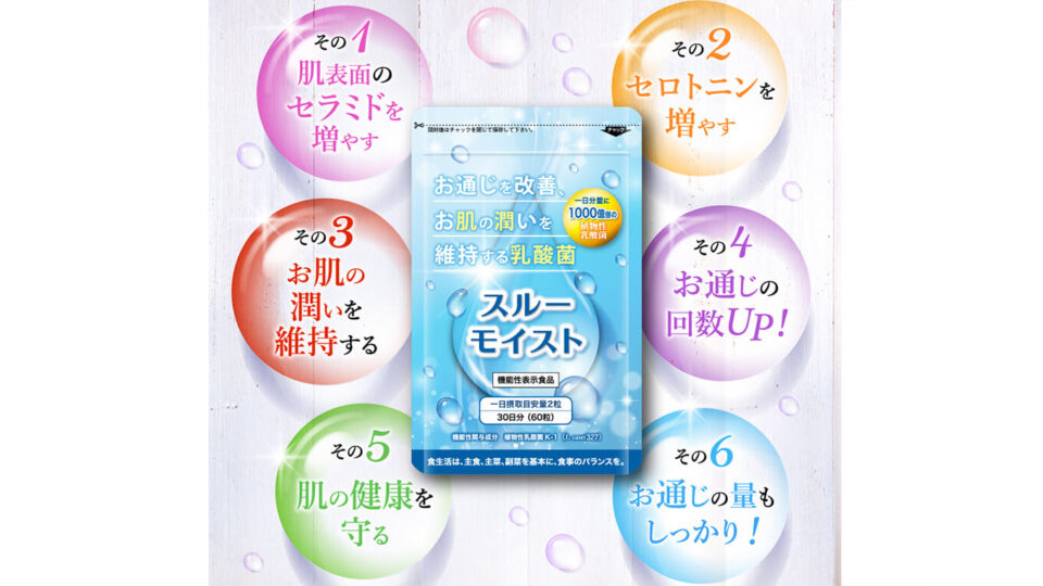【機能性表示食品】スルーモイストは、お米由来の乳酸菌「植物性乳酸菌K-1(L.casei 327)」を一日用量2粒に1000億個配合した、機能性表示食品の届出済みサプリメントです。